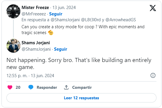 En respuesta al comentario de un usuario en X (Twitter), el nuevo director ejecutivo del estudio, Shams Jorjani, ha aclarado que no está en los planes actuales crear un modo historia cooperativo completo, con secuencias y «escenas trágicas»: «No lo haremos. Lo siento. Eso es como hacer un juego completamente nuevo».